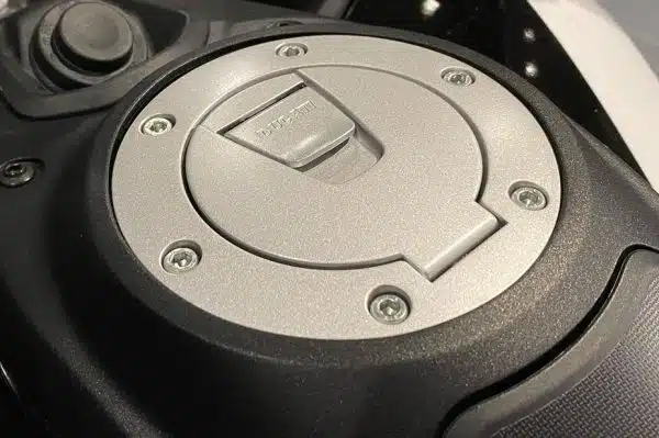 Ouverture sans clé, grâce au système d’ouverture électrique qui se déverrouille automatiquement lorsque la moto est éteinte et se verrouille à nouveau au bout de 60 secondes si le ravitaillement n’est pas effectué.