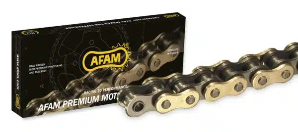 Chaine AFAM couleur OR avec pas de 525 et longueur d’origine de 118 maillons, livrée avec son attache à riveter.