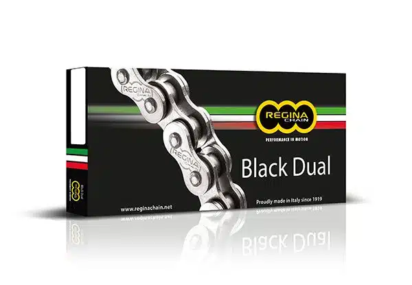 Chaine REGINA ZRA couleur naturelle avec pas de 520 et longueur de 108 maillons, livrée avec son attache à riveter.
