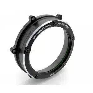 Piece en aluminium taillée masse puis eloxée, de très belle qualité, permet de voir tourner la partie embrayage lorsque le moteur est en fonctionnement. Livré avec le kit de joint d’étanchéité.