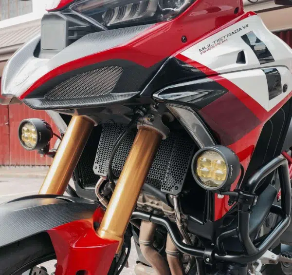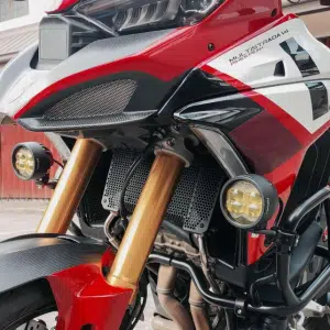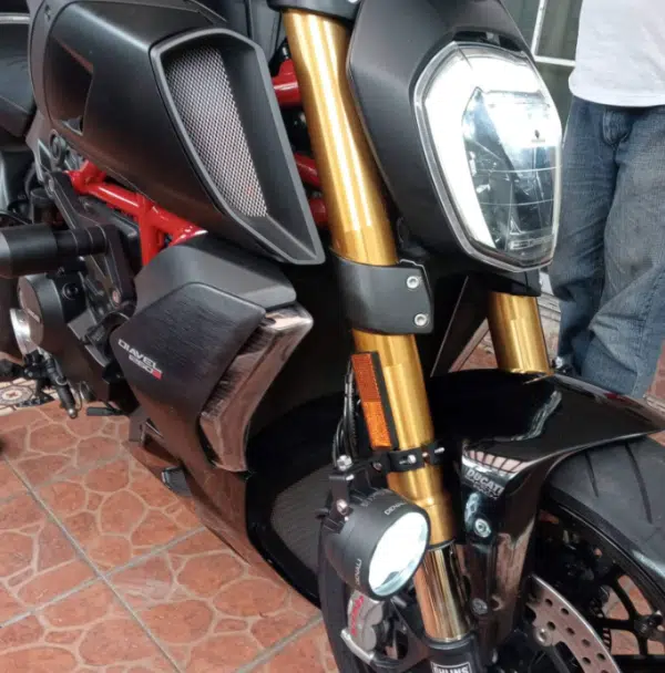 - Support de montage discret. Il faudra commander séparément le système de fixations qui sera le plus adapté à votre moto, soit des supports spécifiques sur le cadre ou fourche soit des colliers de serrage à venir fixer sur les barres de protections latérales si votre moto en est équipée.