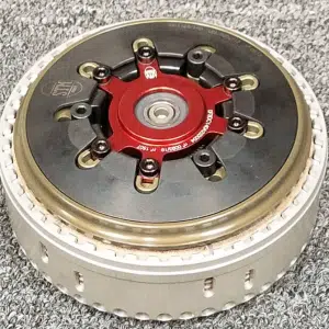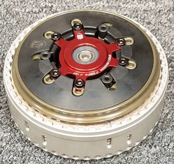 Il s’agit d’un embrayage STM EVO-SBK, réalisé en aluminium usiné dans la masse avec cloche et empilage des disques de 48 dents ; les disques sont 9 menés et 9 garnis avec un diamètre de 138 mm.