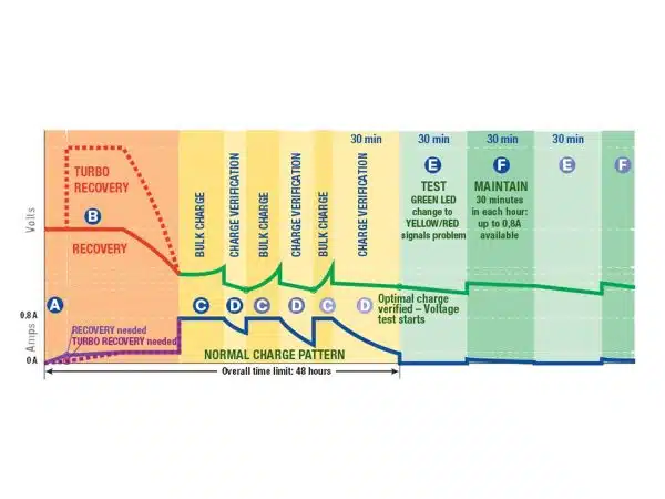 L’OptiMate 4 Dual Program effectue des tests avant et après la charge et peut récupérer une batterie « complètement à plat » à partir de 0,5V. Fonctions avancées dans le programme CAN Bus. Activation automatique SANS CLÉ et maintenance continue jusqu’à la déconnexion du chargeur.