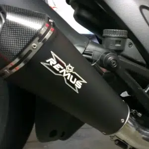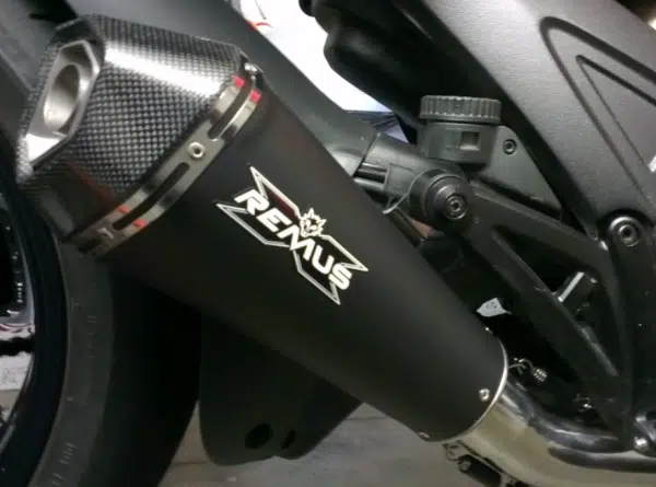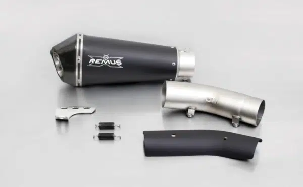Silencieux Hypercone Remus de couleur noir avec embout carbone, incluant la protection thermique et le catalyseur nécessaire à l’homologation.