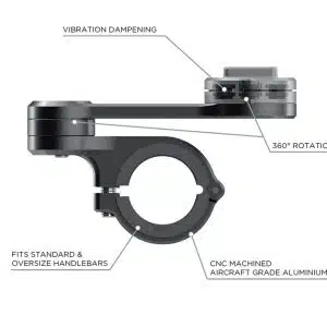 Placez au moyen de la fixation pour moto Pro votre étui de téléphone SP Connect ou d´autres appareils compatibles SP Connect à votre moto. De couleur noire, le support est fraisé CNC en aluminium et convient aux guidons de taille standard et surdimensionnée (0,875 / 1,0 / 1,125 / 1,25 pouces de diamètre)